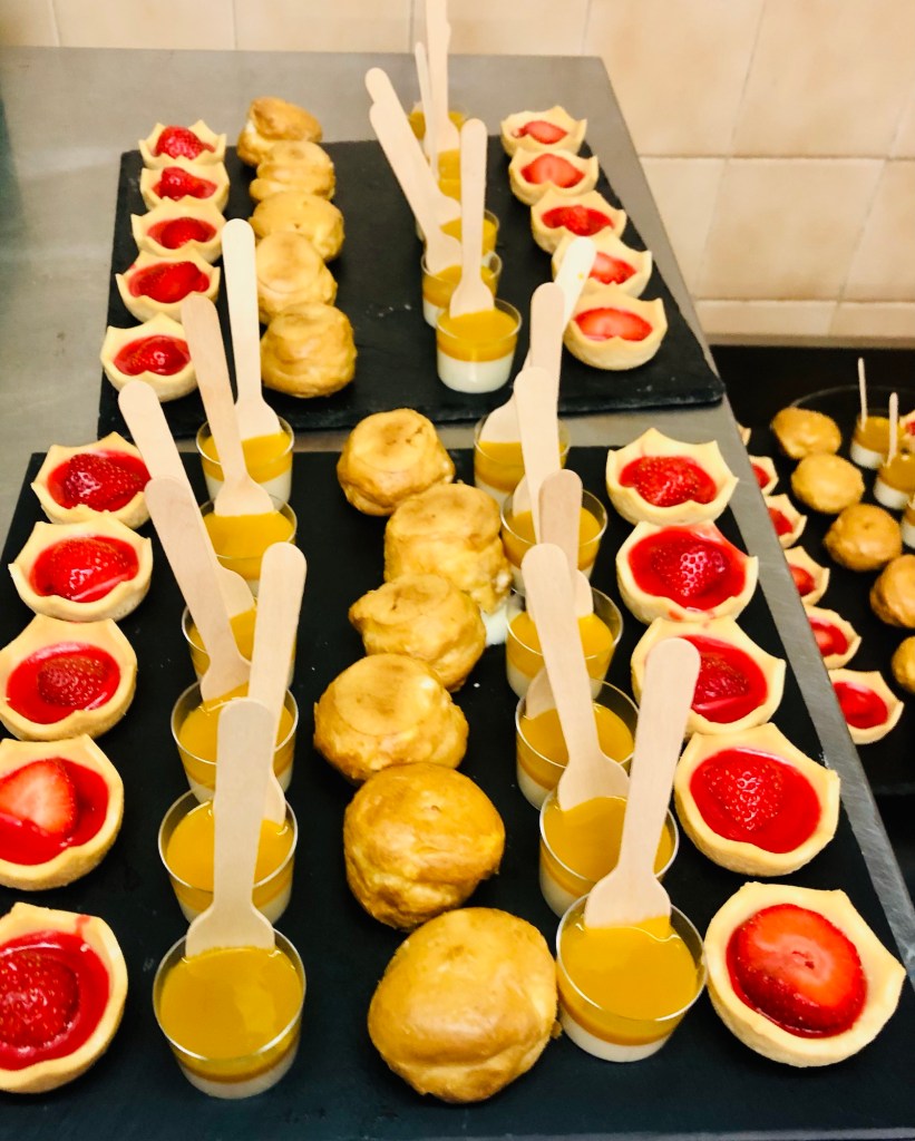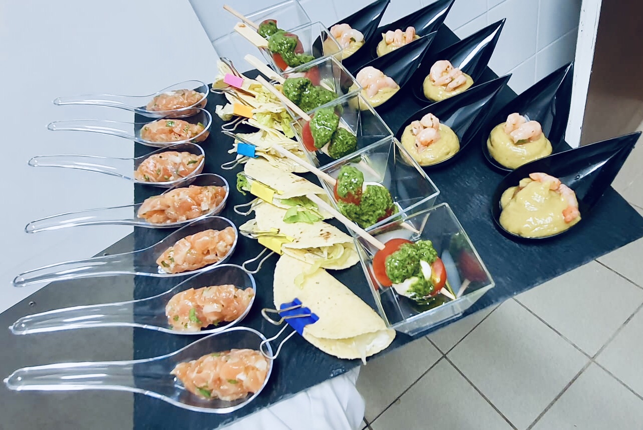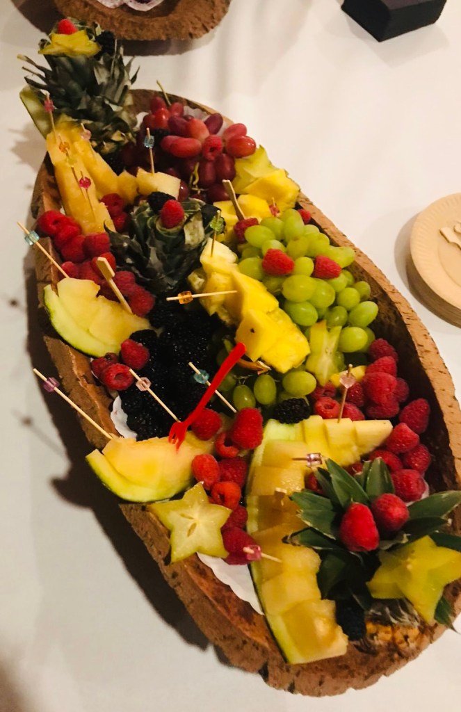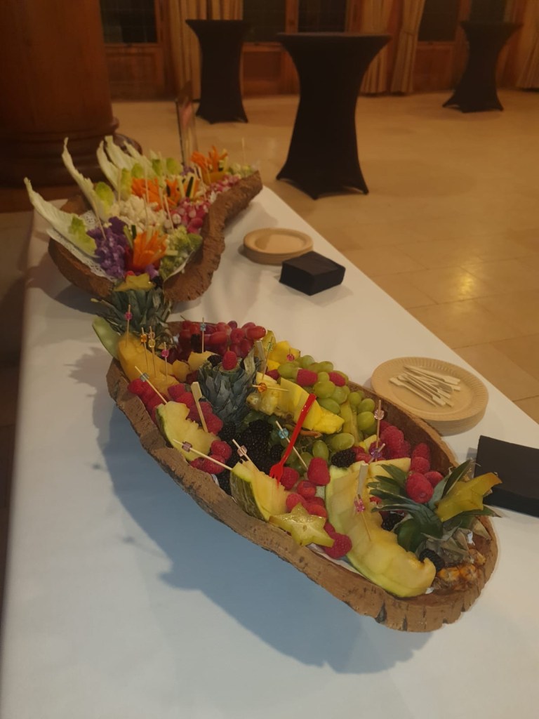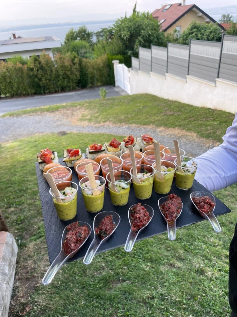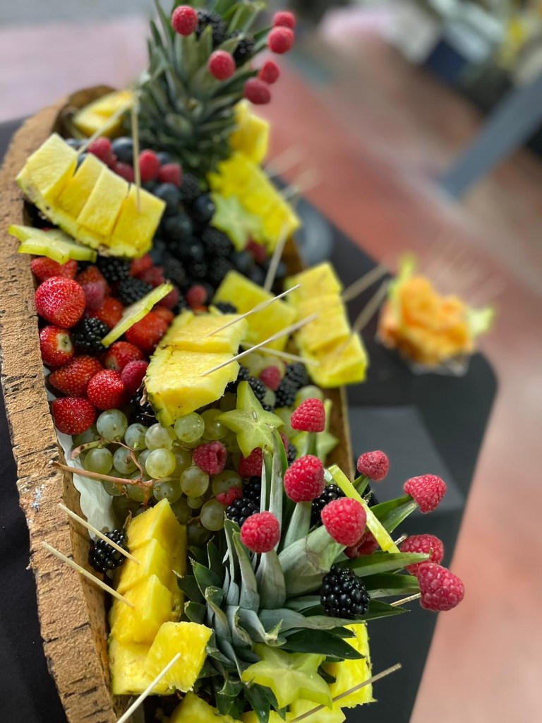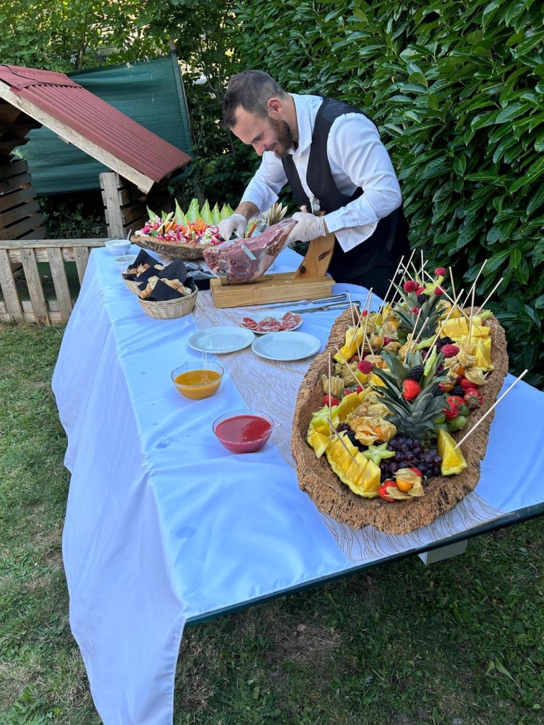 Galerie Bar de fruits Bar de fruits et légumes Bœuf bourguignon en live Cooking Tian de légumes Gratin dauphinois Découpe jambon serano Plateau salés Mignardises
