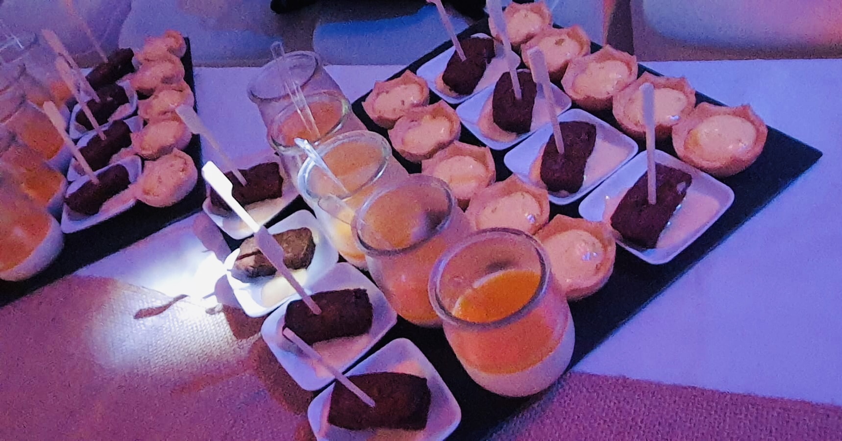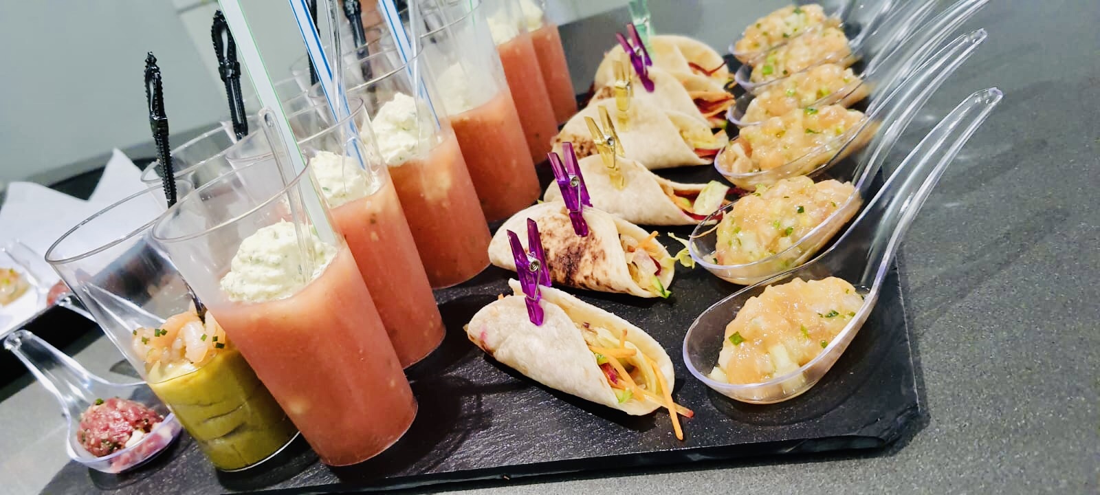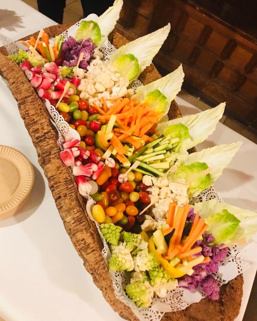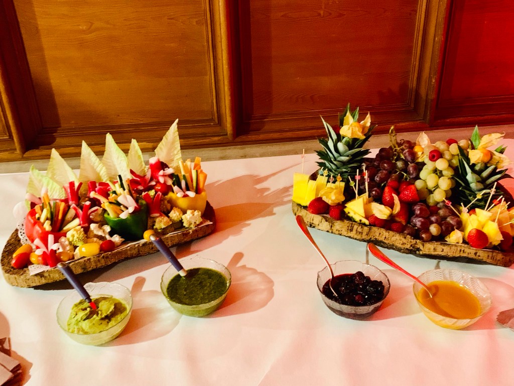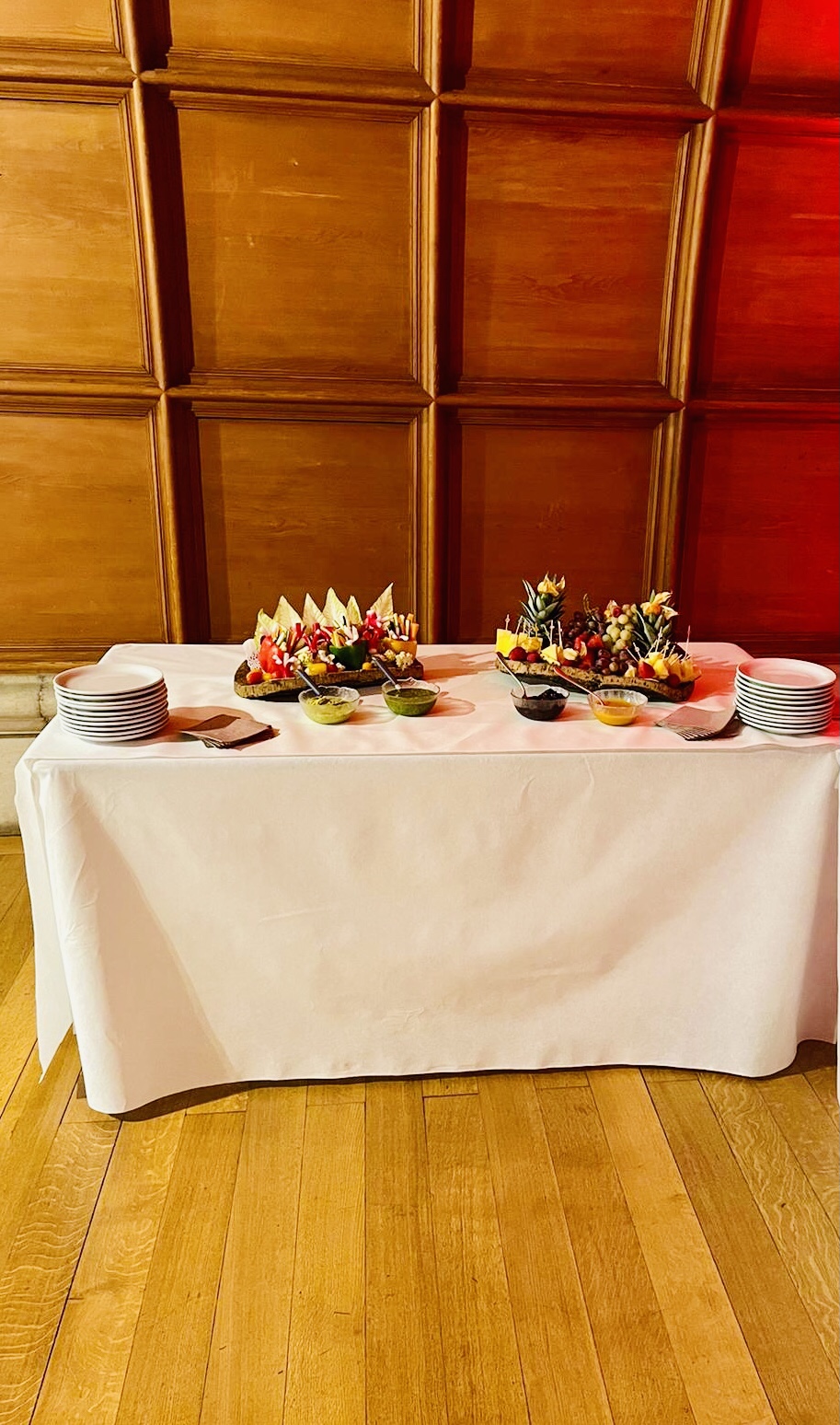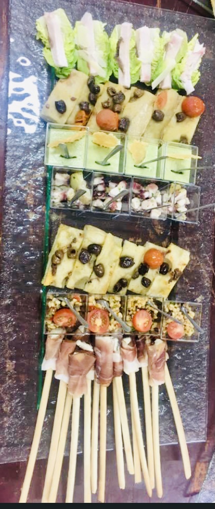 Galerie Bar de fruits Bar de fruits et légumes Bœuf bourguignon en live Cooking Tian de légumes Gratin dauphinois Découpe jambon serano Plateau salés Mignardises